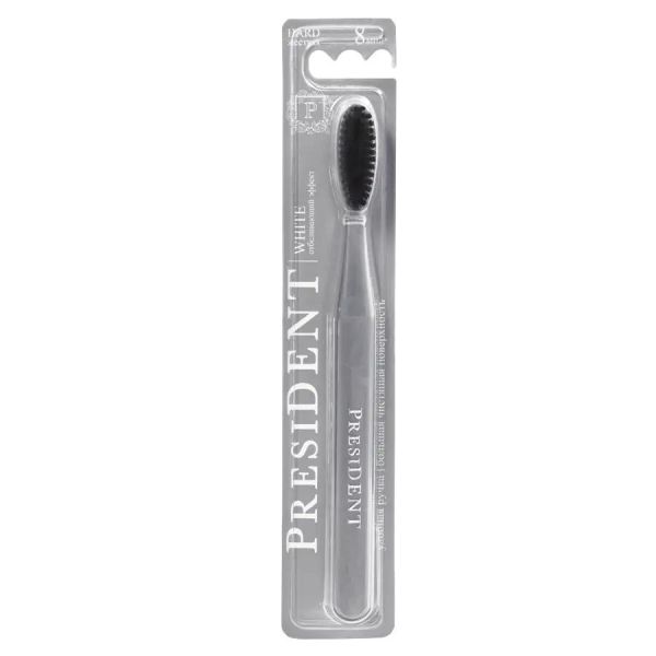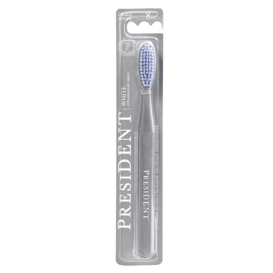 Зубная щетка President White - отбеливающая зубная щетка. , Показатель жесткости: жесткая, 8 мил (Hard). Большая головка обеспечивает быстрое очищение внешних, внутренних и жевательных участков зубного ряда. Закругленные нейлоновые щетинки Medex деликатно полируют зубную эмаль и не травмируют десны. Позволяет эффективно очищать зубной налет, а также предотвращает образование зубного камня.