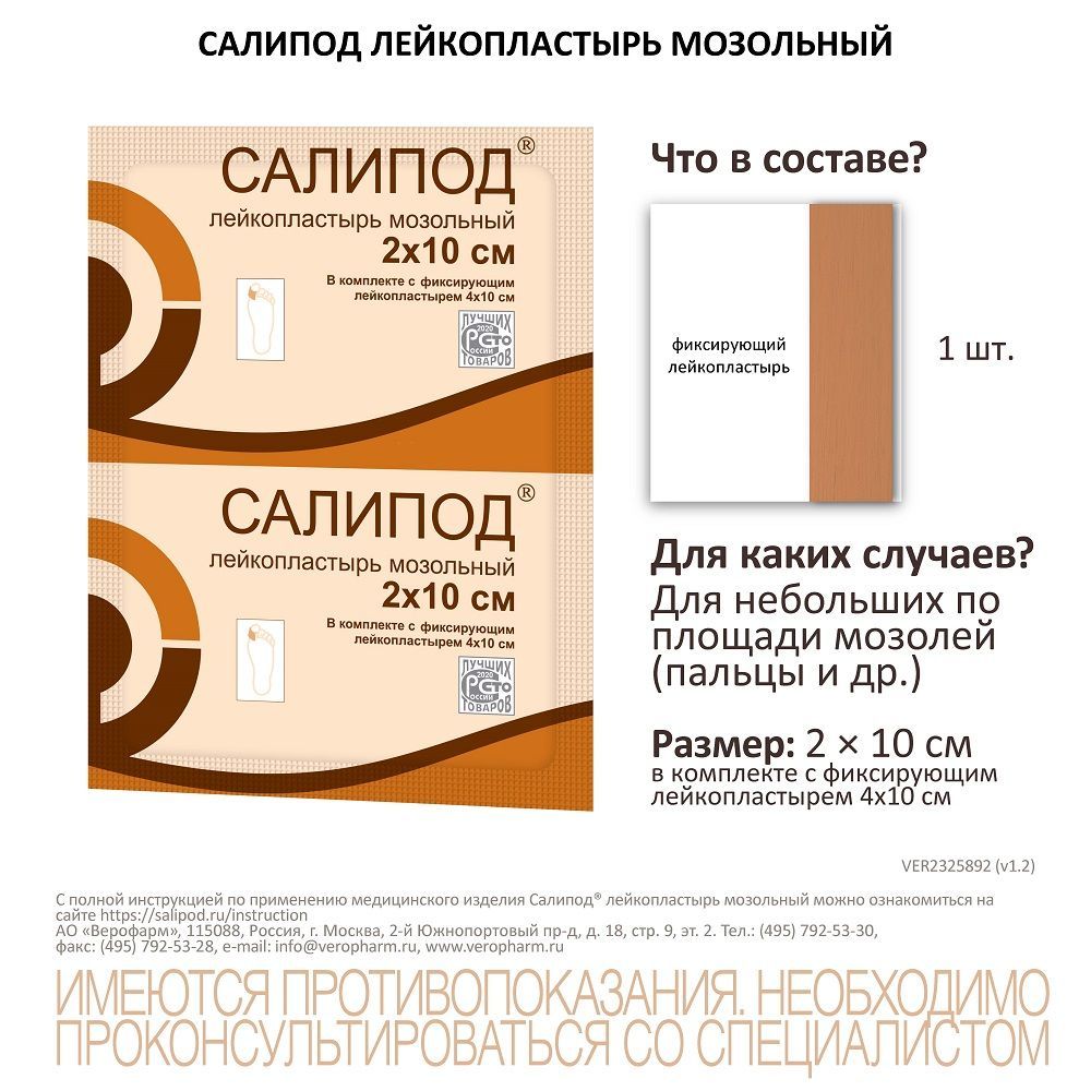САЛИПОД лейкопластырь мозольный борется с сухими мозолями и натоптышами и помогает вернуть красоту Вашим ногам. Салициловая кислота помогает воздействовать на сухую мозоль, размягчая огрубевший верхний слой кожи, улучшая проникновение питательных веществ и облегчая естественное отшелушивание ороговевших клеток. Использование пластыря Салипод c cалициловой кислотой и серой помогает выравниванию рельефа кожи, уменьшению дискомфорта и неприятных ощущений. Использование Салипод позволяет не пачкать руки и одежду. Кератолитическое действие до 48 часов.