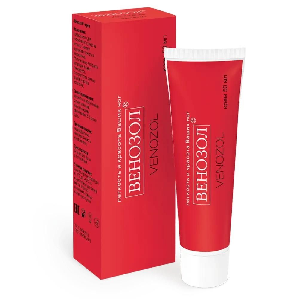 Косметическое средство Венозол крем на основе диосмина, гесперидина и растительных экстрактов для интенсивного ухода за кожей ног при заболеваниях вен для облегчения чувства усталости, тяжести и напряжения в ногах. Состав Венозол крем содержит биологически активные вещества, которые способствуют поддержке венозного тонуса, приданию ощущения легкости и комфорта., Диосмин – биофлаваноид, оказывает венотонизирующее и укрепляющее действие на капилляры, уменьшая их ломкость, нормализуя лимфодренаж и улучшая микроциркуляцию. Способствует уменьшению отечности ног, чувства тяжести и усталости, болевого синдрома, улучшению тонуса вен., Гесперидин – биофлаваноид, оказывает венотонизирующее и капилляроукрепляющее действия. Обладает способностью повышать тонус вен и способствует снижению явлений венозного застоя, укреплять капилляры и улучшать микроциркуляцию и лимфоотток, вследствие чего снижается тяжесть и отечность ног., Ennacomplex 269 – растительный комплекс на основе экстрактов листьев лесного ореха, корневищ иглицы шиповатой, листьев красного винограда, коры сосны - обладает тонизирующими способностями, оказывает противовоспалительное действие, способен улучшать микроциркуляцию., Экстракт арники горной обладает противовоспалительной активностью, оказывает влияние на свертывание крови. Способствует снижению воспаления, предотвращению образования тромбов, Экстракт лещины (лесного орешника) является источником биофлаваноидов, обладает капилляроукрепляющими свойствами. Способствует укреплению стенок сосудов, повышению их эластичности, улучшению местного кровообращения., Гамамелиса экстракт обладает противовоспалительным свойством, способствует снижению воспаления. Экстракт из листьев гамамелиса применяется как кровоостанавливающее и капилляропротекторное средство. , Витамин Р (рутин) - мощный биофлавоноид, который способствует поддержке кровообращения благодаря повышению тонуса вен., Витамин Е - основной антиоксидант кожного барьера, защищает клетки кожи от УФ – излучения. Выравнивает рельеф кожи, улучшает эпителизацию, питает и смягчает роговой слой, обладает противовоспалительной активностью., Крем рекомендуется наносить мягкими массирующими движениями для дополнительного воздействия. Благодаря плотной комфортной текстуре крема Венозол быстро впитывается, не оставляя следов и ощущения липкости. , Линейка «Венозол» предназначена для поддержки венозного тонуса и включает в себя биологически активные добавки для внутреннего применения и косметические средства для комплексного воздействия изнутри и снаружи. Венозол крем может применяться как самостоятельное косметическое средство, так и в сочетании с капсулами «Венозол» или «Венозол 360 мг».