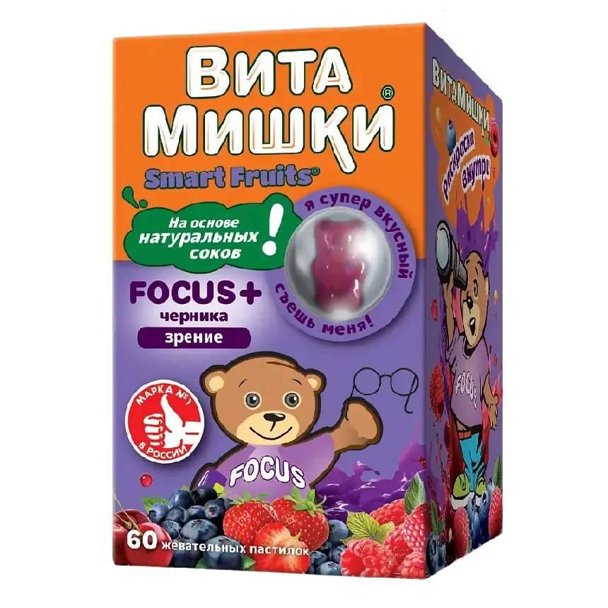 ВитаМишки Smart Fruits ФОКУС + черника №60. Витамины для детей с черникой для зрения + витамин Е + витамин В12. ВитаМишки Focus + черника - сбалансированный витаминно-минеральный комплекс в виде вкусных мармеладных пастилок мишек с натуральными фруктовыми и овощными экстрактами, для детей с 3-х лет.