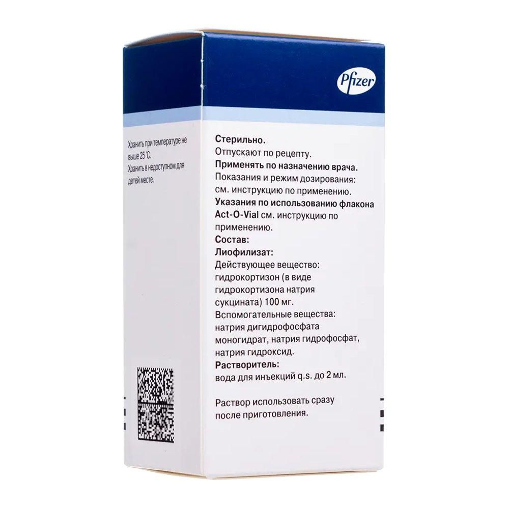 1 фл. содержит гидрокортизон (в форме натрия сукцината) 100 мг;, , Вспомогательные вещества:, натрия дигидрофосфата моногидрат - 900 мкг, , натрия гидрофосфат - 8.8 мг. , Растворитель:, бензиловый спирт - 18 мг, , вода д/и - q.s. до 2 мл.