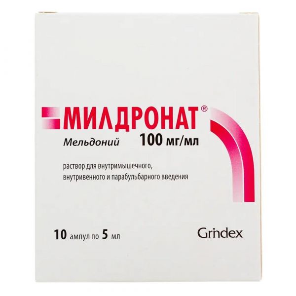 В/м, в/в и парабульбарно. Ввиду возможного развития возбуждающего эффекта рекомендуется применять в первой половине дня., Способ введения, дозы и продолжительность курса лечения устанавливают индивидуально, в зависимости от показаний и тяжести состояния., Сердечно-сосудистые заболевания, В составе комплексной терапии:, - ИБС (инфаркт миокарда) — в/в струйно по 0,5–1 г в день (5–10 мл препарата МИЛДРОНАТ®);, - ИБС (стабильная стенокардия); ХСН и кардиомиопатии на фоне дисгормональных нарушений — в/в струйно по 0,5–1 г в день (5–10 мл препарата МИЛДРОНАТ®) или в/м по 0,5 г 1–2 раза в сутки, курс лечения — 10–14 дней, с последующим переходом на прием внутрь. Общий курс лечения — 4–6 нед., Нарушение мозгового кровообращения, В составе комплексной терапии в острой фазе по 0,5 г (5 мл препарата МИЛДРОНАТ®) 1 раз в день в/в в течение 10 дней, переходя на прием внутрь по 0,5–1 г. Общий курс лечения — 4–6 нед., При хронической недостаточности мозгового кровообращения (дисциркуляторная энцефалопатия) — по 0,5 г (5 мл препарата МИЛДРОНАТ®) в/м или в/в 1 раз в день в течение 10 дней, затем по 0,5 г внутрь. Общий курс лечения — 4–6 нед., Повторные курсы (обычно 2–3 раза в год) возможны после консультации с врачом., Офтальмопатология (гемофтальм и кровоизлияния в сетчатку различной этиологии, тромбоз центральной вены сетчатки и ее ветвей, ретинопатии различной этиологии (диабетическая, гипертоническая), По 0,05 г (0,5 мл препарата МИЛДРОНАТ®) парабульбарно в течение 10 дней. В т.ч. применяется в составе комбинированной терапии., Умственные и физические перегрузки, По 0,5 г (5 мл препарата МИЛДРОНАТ®) в/м или в/в 1 раз в день. Курс лечения — 10–14 дней. При необходимости лечение повторяют через 2–3 нед., Хронический алкоголизм, По 0,5 г (5 мл препарата МИЛДРОНАТ®) в/м или в/в 2 раза в день. Курс лечения — 7–10 дней.