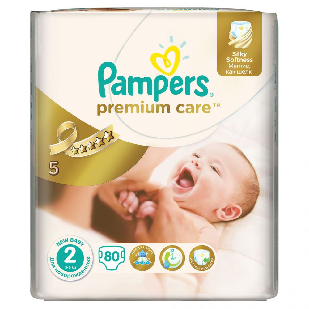 Новые Pampers Premium Care — наши лучшие подгузники, которые обеспечивают защиту кожи “5 звезд” и дарят непревзойденную мягкость шелка. Это первые и единственные подгузники с впитывающими каналами, обеспечивающими до 12 часов сухости.