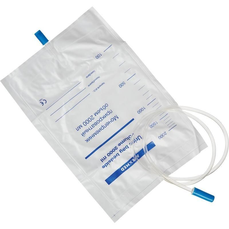 Прикроватный мочеприемник одноразового применения с универсальным переходником для любого типа катетера, градуированной шкалой и обратным клапаном. Применяется для сбора мочи через катетер у лежачих больных. Стерилен. Крепится вертикально к кровати пациента. Длина трубки — 90 см.
