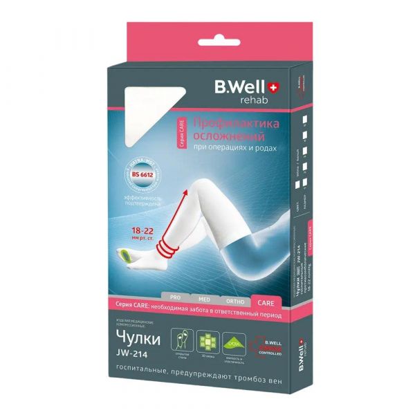 Чулки компрессионные госпитальные (противоэмболические) B.Well rehab JW-214, I класс компрессии 18-21 мм рт. ст предназначены для профилактики венозных тромбозов и венозных тромбоэмболических осложнений (ВТЭО) в условиях стационара., - Обеспечивают профилактику тромбообразования при беременности и послеродовый период;, - Способствуют усилению оттока венозной крови, препятствуют образованию тромбов;, - Помогают избежать осложнений после операции и родов - тромбоэмболии легочной артерии (ТЭЛА);, - Эффективно снижают риск развития тромбоза глубоких вен (за счет распределенной компрессии);, - Обеспечивают необходимую циркуляцию крови у лежачих больных;, - Выдавливают лимфодренаж и межтканевую жидкость, уменьшая образование отеков.