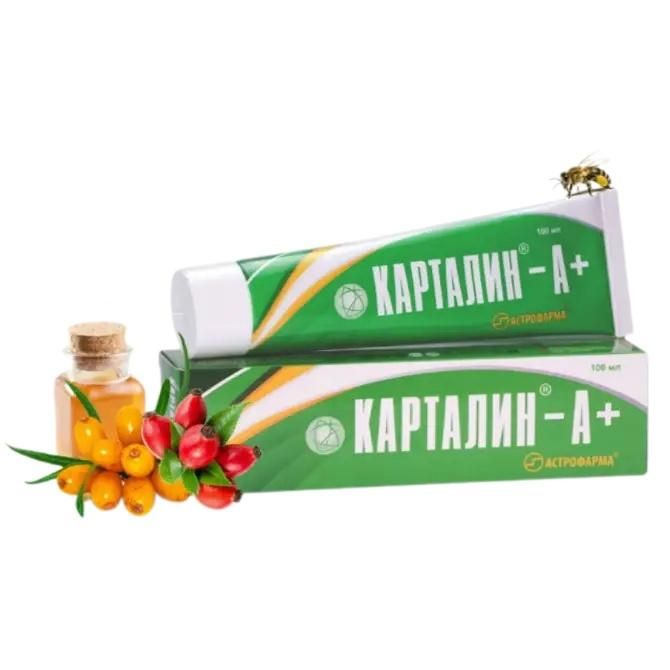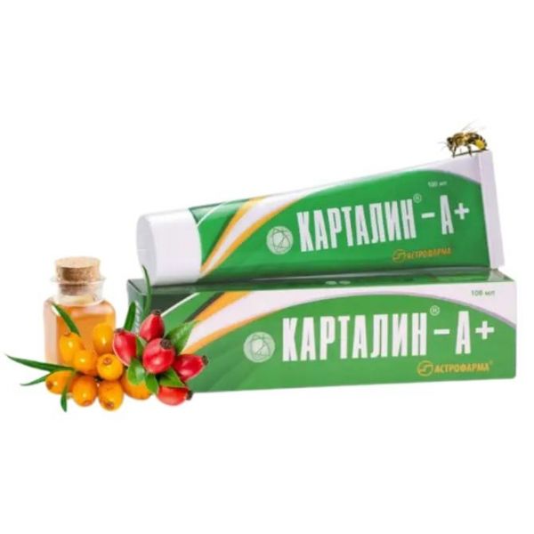 КАРТАЛИН-А+ -крем негормонального происхождения, обогащенный активными веществами, имеющими высокую степень биодоступности: солидол, лизоцим, мед пчелиный, масло облепиховое, лекарственные травы - череда, ромашка, масло шиповника, изопропилметилфенол, витамин Е, витамин А, масло лавандовое, масло эвкалиптовое, салициловая кислота.