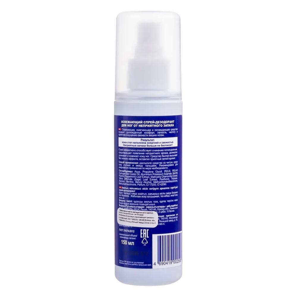 Удобный в применении, освежающий спрей-дезодорант эффективно способствует снижению потоотделения, предотвращает появление неприятного запаха, освежает и деликатно ухаживает за кожей ног. Спрей идеально подходит для людей с повышенным потоотделением и ведущим активный образ жизни., Активные компоненты спрея-дезодоранта идеально рассчитаны для достижения продолжительного и комплексного эффекта: входящие в состав минеральные квасцы регулируют потоотделение, ментол охлаждает и тонизирует кожу ступней, триклозан уничтожает бактерии и препятствует их размножению, а экстракт мяты придаёт ногам свежесть и комфорт.