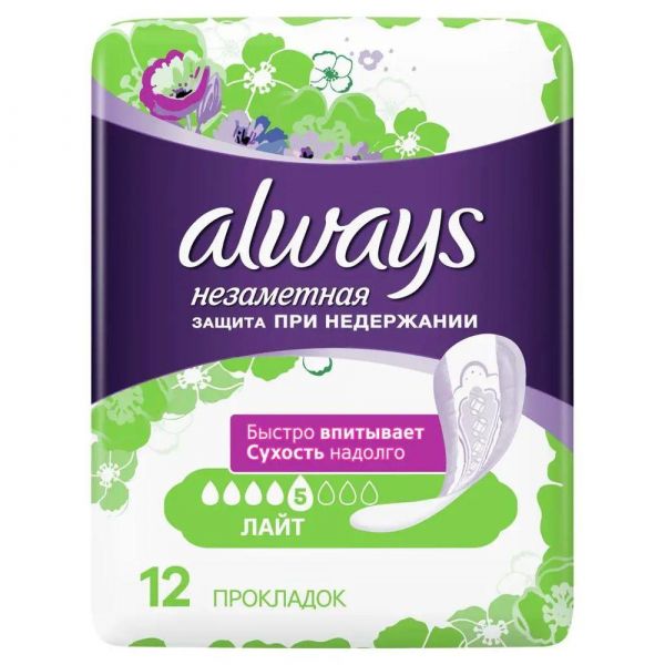 Прокладки Always Незаметная защита при недержании Лайт, 12 шт. Для тех моментов, когда вам необходима дополнительная защита, есть прокладки Always «Незаметная защита при недержании». Они впитывают в 3 раза больше жидкости, чем обычные ежедневные прокладки*, и надолго сохраняют сухость. Кроме того, они оснащены технологией нейтрализации запаха, которая дарит непревзойденную свежесть и обеспечивает чувство уверенности. Попробуйте прокладки Always «Незаметная защита» для защиты при недержании. , *по сравнению с самыми популярными ежедневными прокладками в России , - Быстро впитывает. Сухость надолго — ультравпитывающий внутренний слой превращает жидкость в гель и удерживает его внутри, - Эксклюзивная технология нейтрализации запаха, - Удерживается на месте, обеспечивая комфорт, - Защитные барьеры LeakGuards, - Проверено дерматологами, - С легким ароматом, - прокладки Always «Незаметная защита при недержании» Лайт подходят при слабых и редких выделениях