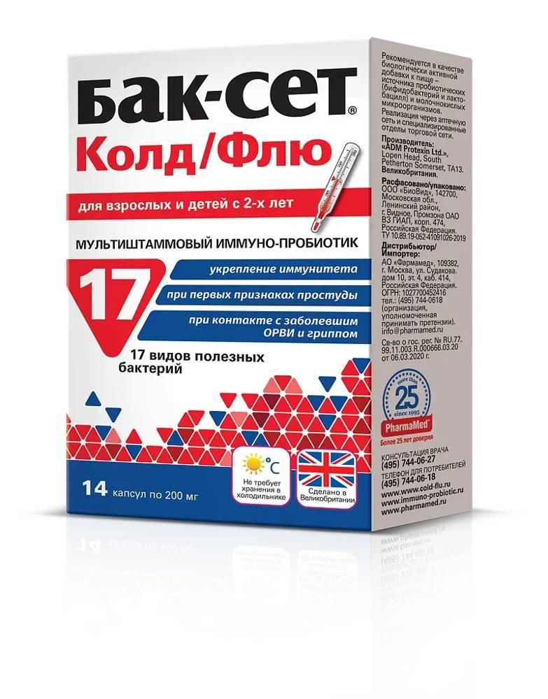 Продукт принимают внутрь. Капсулы следует проглатывать целиком, запивая водой., При применении комплекса у детей в возрасте до 5 лет следует высыпать содержимое капсулы в любой напиток и дать ребенку выпить во время приема пищи., Накануне холодного времени года: детям в возрасте с 2 до 12 лет - по 1 капс./сут утром; детям старше 12 лет и взрослым - по 2 капс. 1 раз/сут утром. Продолжительность приема - 2 недели. Курс можно повторить через 2 недели., В холодное время года: детям в возрасте с 2 до 12 лет - по 2 капс./сут утром; детям и подросткам в возрасте с 12 до 18 лет - по 3 капс. 1 раз/сут утром; взрослым - по 4 капс. 1 раз/сут утром. Продолжительность приема - 1 неделя. Курс можно повторить через 2 недели., Накануне сезонного подъема заболеваемости простудными заболеваниями (ОРВИ) Бак-Сет® Колд/Флю рекомендуется принимать повторными курсами по 2 недели. Детям рекомендуется начать принимать Бак-Сет® Колд/Флю за 2 недели до начала посещения детского сада или школы., В сезон простудных заболеваний, при контакте с заболевшим ОРВИ и гриппом или нахождении в эпидемическом очаге начать принимать Бак-Сет® Колд/Флю рекомендуется как можно раньше, повторными курсами по 1 неделе., Продолжительность приема – 7-14 дней. При необходимости прием можно повторить через 2 недели.