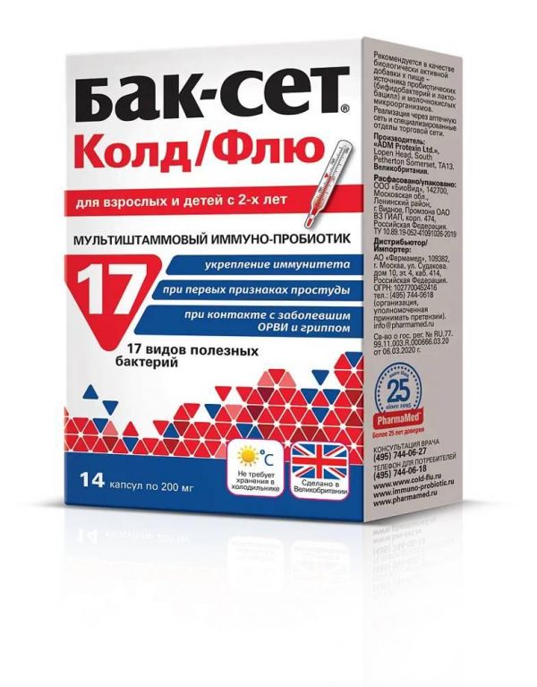 Мультиштаммовый иммуно-пробиотик Бак-Сет Колд/Флю - естественный активатор иммунитета, повышает сопротивляемость простудным и вирусным заболеваниям, не вторгаясь грубо в собственные защитные механизмы организма, поэтому его можно принимать часто болеющим детям, беременным и кормящим женщинам, пожилым людям. Бак-Сет Колд/Флю нужен тем, кто хочет реже болеть или не болеть вовсе в сезон простуд; тем, кто, заболев, хочет перенести ОРВИ легко и без осложнений; тем, кто контактирует с большим количеством людей по роду своей деятельности (врачи, фармацевты, педагоги, работники сферы услуг).