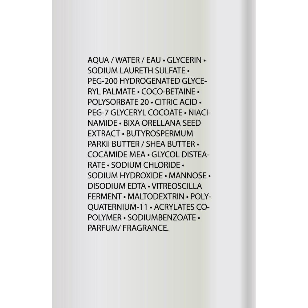 AQUA / WATER / EAU, GLYCERIN, SODIUM, LAURETH SULFATE, PEG-200 HYDROGENATED GLYCERYL PALMATE, COCO-BETAINE, POLYSORBATE 20, CITRIC ACID, PEG-7 GLYCERYL COCOATE, NIACINAMIDE, BIXA ORELLANA SEED EXTRACT, BUTYROSPERMUM PARKII BUTTER / SHEA BUTTER, COCAMIDE MEA, GLYCOL DISTEARATE, SODIUM CHLORIDE, SODIUM HYDROXIDE, MANNOSE, DISODIUM EDTA, VITREOSCILLA FERMENT, MALTODEXTRIN, POLYQUATERNIUM-11, ACRYLATES COPOLYMER, SODIUM BENZOATE, PARFUM / FRAGRANCE (CODE F.I.L.: B275139/1).