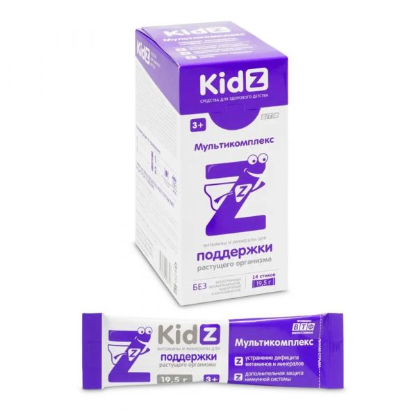 Kidz Мультикомплекс содержит 12 витаминов, 11 минералов + лецитин и холин в желейном батончике., В составе комплекса:, Β-каротин, витамины С, Е и цинк помогают защититься от инфекций, укрепить иммунитет., Витамины группы В улучшают работу нервной системы, память и настроение., Витамины D3, K1, кальций и фосфор задействованы в формировании костей и зубов, свертывании крови, кальций-фосфорном обмене., Магний, калий и медь регулируют работу сердца., Железо насыщает ткани кислородом, повышает тонус, препятствует быстрой утомляемости., Селен, хром и марганец нормализуют работу щитовидной железы., Йод поддерживает умственное развитие ребенка., Лецитин и холин повышают усидчивость и работоспособность., Компоненты комплекса будут полезны:, · в период активного роста;, · для предупреждения дефицита витаминов и минералов;, · для поддержки иммунитета в сезон простуд;, · для обогащения рациона питания., Рекомендации по применению: детям от 3 до 7 лет – по 1 стику 1 раз в день, детям от 7 до 18 лет – по 1 стику 2 раза в день, непосредственно после еды. Продолжительность приема – 1 месяц. При необходимости прием можно повторить., БАД. Не является лекарственным средством., Перед применением рекомендуется проконсультироваться с врачом (специалистом).
