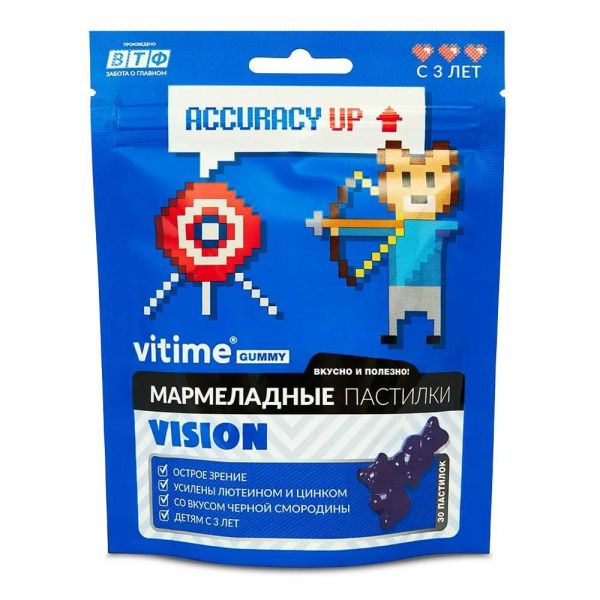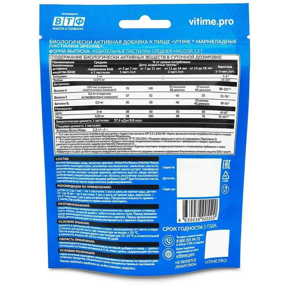 VITime ® Мармеладные пастилки Зрение для детей со вкусом черной смородины - комплекс лютеина, экстракта черники, витаминов и минералов для поддержания нормальной работы органов зрения., Возраст: с 3-х лет, Проблема снижения зрения у детей очень актуальна: нагрузки на учебе и легкий доступ к гаджетам ведут к тому, что почти у каждого второго ребенка к концу начальной школы есть нарушения зрения., В составе комплекса VITime® Gummy VISION:, • лютеин и антоцианы черники, которые защищают сетчатку глаза;, • витамин А, необходимый для нормальной работы глаз;, • витамин В2, который поддерживает сумеречное зрение;, • витамин Е, который предупреждает заболевания глаз;, • цинк, сохраняющий остроту зрения;, • медь укрепляющая кровеносные сосуды., Преимущества, • Мармеладные пастилки на основе натурального сока., • Без ГМО, искусственных красителей и ароматизаторов., • Оптимальное количество лютеина и экстракта черники в каждой пастилке., • Со вкусом черной смородины., Компоненты комплекса могут использоваться:, • для защиты и поддержки органов зрения;, • для сохранения остроты зрения;, • при зрительных нагрузках: во время учебы или работы за компьютером., Способ применения и дозы:, Детям от 3 до 7 лет - по 1 пастилке 1 раз в день во время еды,, детям от 7 до 18 лет - по 2 пастилки 1 раз в день во время еды,, взрослым - по 2-3 пастилки 1 раз в день во время еды., Продолжительность приема - 1 месяц., При необходимости прием можно повторить., БАД. Не является лекарственным средством., Перед применением рекомендуется проконсультироваться с врачом (специалистом).