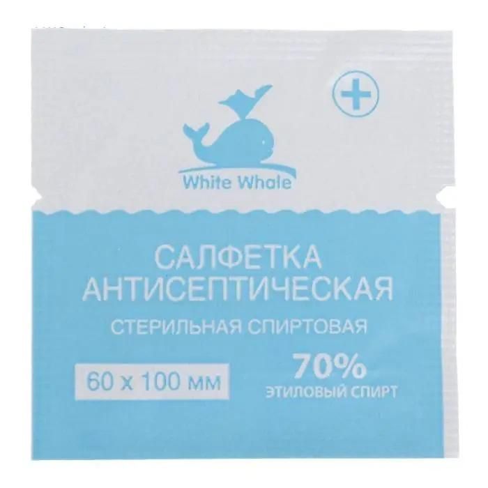 Салфетка антисептическая White Whale 70% спирта – спиртовая стерильная салфетка на основе текстилеподобного материала и 70% этилового спирта. Для одноразового применения., Салфетка используется для дезинфекции и обработки кожи до и после инъекций, украшений для пирсинга, для противомикробной и антибактериальной гигиены кожи рук, для дезинфекции инструментов и оборудования.