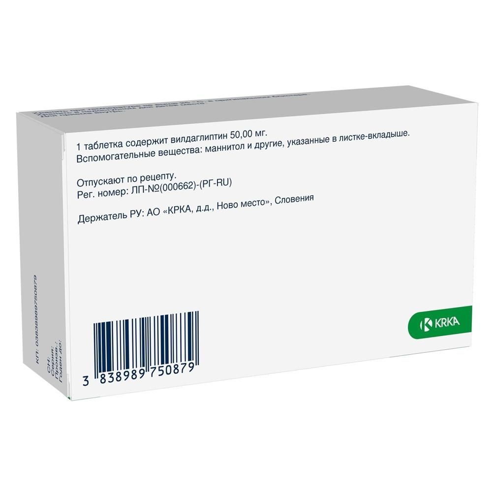 Фармакодинамические свойства, Фармакотерапевтическая группа: средства для лечения сахарного диабета; гипогликемические средства, кроме инсулинов; ингибиторы дипептидилпептидазы-4 (ДПП-4), Код АТХ: A10BH02, Механизм действия, Вилдаглиптин – представитель класса стимуляторов островкового аппарата поджелудочной железы, является мощным и селективным ингибитором дипептидилпептидазы-4 (ДПП-4), улучшающим гликемический контроль. Ингибирование вилдаглиптином ДПП-4 приводит к увеличению базального и постпрандиального эндогенного уровня инкретиновых гормонов – глюкагоноподобного пептида 1 (ГПП-1) и глюкозозависимого инсулинотропного полипептида (ГИП)., Фармакодинамические эффекты, При применении вилдаглиптина в дозе 50–100 мг в сутки у пациентов с СД 2 типа отмечается улучшение функции β-клеток поджелудочной железы. Степень улучшения функции β-клеток зависит от степени их исходного повреждения; так у лиц без СД 2 типа (с нормальной концентрацией глюкозы в плазме крови) вилдаглиптин не стимулирует секрецию инсулина и не снижает концентрацию глюкозы., Повышая концентрацию эндогенного ГПП-1, вилдаглиптин увеличивает чувствительность α-клеток к глюкозе, что приводит к улучшению глюкозозависимой регуляции секреции глюкагона. Снижение повышенной концентрации глюкагона во время еды, в свою очередь, вызывает уменьшение инсулинорезистентности., Увеличение соотношения инсулин/глюкагон на фоне гипергликемии, обусловленное повышением концентрации ГПП-1 и ГИП, вызывает уменьшение продукции глюкозы печенью как во время, так и после приема пищи, что приводит к снижению концентрации глюкозы в плазме крови., Кроме того, на фоне применения вилдаглиптина отмечается снижение концентрации липидов в плазме крови после приема пищи, однако этот эффект не связан с его действием на ГПП-1 или ГИП и улучшением функции островковых клеток поджелудочной железы., Известно, что повышение концентрации ГПП-1 может приводить к замедлению опорожнения желудка, однако на фоне применения вилдаглиптина подобного эффекта не наблюдается., При применении вилдаглиптина у 5795 пациентов с СД 2 типа в течение 52 недель в монотерапии или в комбинации с метформином, производными сульфонилмочевины, тиазолидиндионом, или инсулином отмечалось достоверное длительное снижение концентрации гликированного гемоглобина (НbА1с) и глюкозы крови натощак., При применении комбинации вилдаглиптина и метформина в качестве начальной терапии у пациентов с СД 2 типа в течение 24 недель отмечалось дозозависимое снижение концентрации НbА1с в сравнении с монотерапией данными препаратами. Случаи развития гипогликемии были минимальны в обеих группах терапии., При применении вилдаглиптина в дозе 50 мг 1 раз в сутки в течение 6 месяцев у пациентов с СД 2 типа с нарушением функции почек средней (СКФ ≥ 30, < 50 мл/мин/1,73 м2) или тяжелой (СКФ < 30 мл/мин/1,73 м2) степени отмечалось клинически значимое снижение концентрации HbAlc по сравнению с плацебо., При применении вилдаглиптина в дозе 50 мг 2 раза в сутки в комбинации с/без метформина и инсулином (средняя доза 41 ЕД/сут) было продемонстрировано снижение показателя НbА1с на 0,77 % от исходного среднего значения 8,8 % со статистически достоверной разницей с плацебо 0,72 % Частота гипогликемии в группе вилдаглиптина сравнима с таковой в группе плацебо., При применении вилда