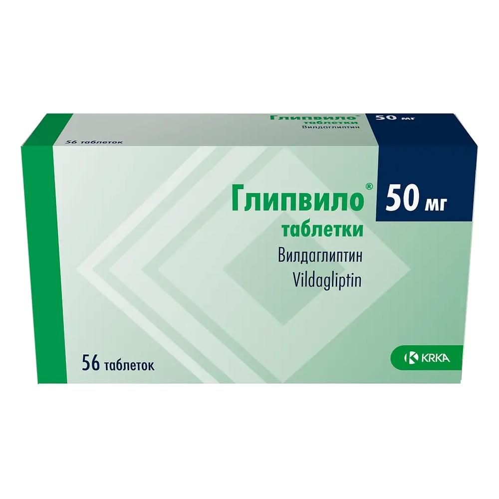 Режим дозирования, Дозу препарата Глипвило следует подбирать индивидуально в зависимости от эффективности и переносимости., Рекомендуемая доза составляет 50 мг 1 или 2 раза в день. Максимальная суточная доза препарата составляет 100 мг., Рекомендуемая доза препарата в монотерапии или в составе комбинированной терапии с метформином, тиазолидиндионом или инсулином (в комбинации с метформином или без метформина), составляет 50 мг или 100 мг в сутки., Рекомендуемая доза препарата Глипвило в составе двойной комбинированной терапии с препаратами сульфонилмочевины составляет 50 мг 1 раз в сутки утром. В этой популяции пациентов эффективность препарата Глипвило в дозе 100 мг в сутки была сходной с таковой в дозе 50 мг в сутки., Рекомендованная доза препарата Глипвило в составе тройной комбинированной терапии (вилдаглиптин + производные сульфонилмочевины + метформин) составляет 100 мг в сутки., Если цели гликемического контроля не достигнуты на фоне применения максимальной суточной дозы 100 мг, следует рассмотреть возможность добавления к терапии препаратом Глипвило других гипогликемических препаратов, таких как метформин, производные сульфонилмочевины, тиазолидиндион или инсулин., Особые группы пациентов, Пациенты с нарушением функции почек, У пациентов с нарушением функции почек легкой степени (скорость клубочковой фильтрации (СКФ) > 60 мл/мин/1,73 м2) и средней степени с СКФ 50–60 мл/мин/1,73 м2 не требуется коррекции режима дозирования препарата. У пациентов с нарушением функции почек средней степени с СКФ 30–50 мл/мин/1,73 м2 и тяжелой степени (СКФ < 30 мл/мин/1,73 м2), включая терминальную стадию хронической болезни почек (ХБП) у пациентов, находящихся на гемодиализе или проходящих процедуру гемодиализа, препарат следует применять в дозе 50 мг 1 раз в сутки., Пациенты в возрасте ≥ 65 лет, У пациентов пожилого возраста не требуется коррекции режима дозирования препарата Глипвило., Дети, Поскольку опыта применения вилдаглиптина у детей и подростков младше 18 лет нет, не рекомендуется применять этот препарат у пациентов данной категории., Способ применения, Дозу 50 мг в сутки следует принимать 1 раз в день утром, дозу 100 мг в сутки следует делить на 2 приема – по 50 мг утром и вечером. В случае пропуска приема препарата следует принять пропущенную дозу как можно скорее. При этом следует избегать принятия удвоенной дозы в один день., Препарат Глипвило принимают внутрь независимо от приема пищи.
