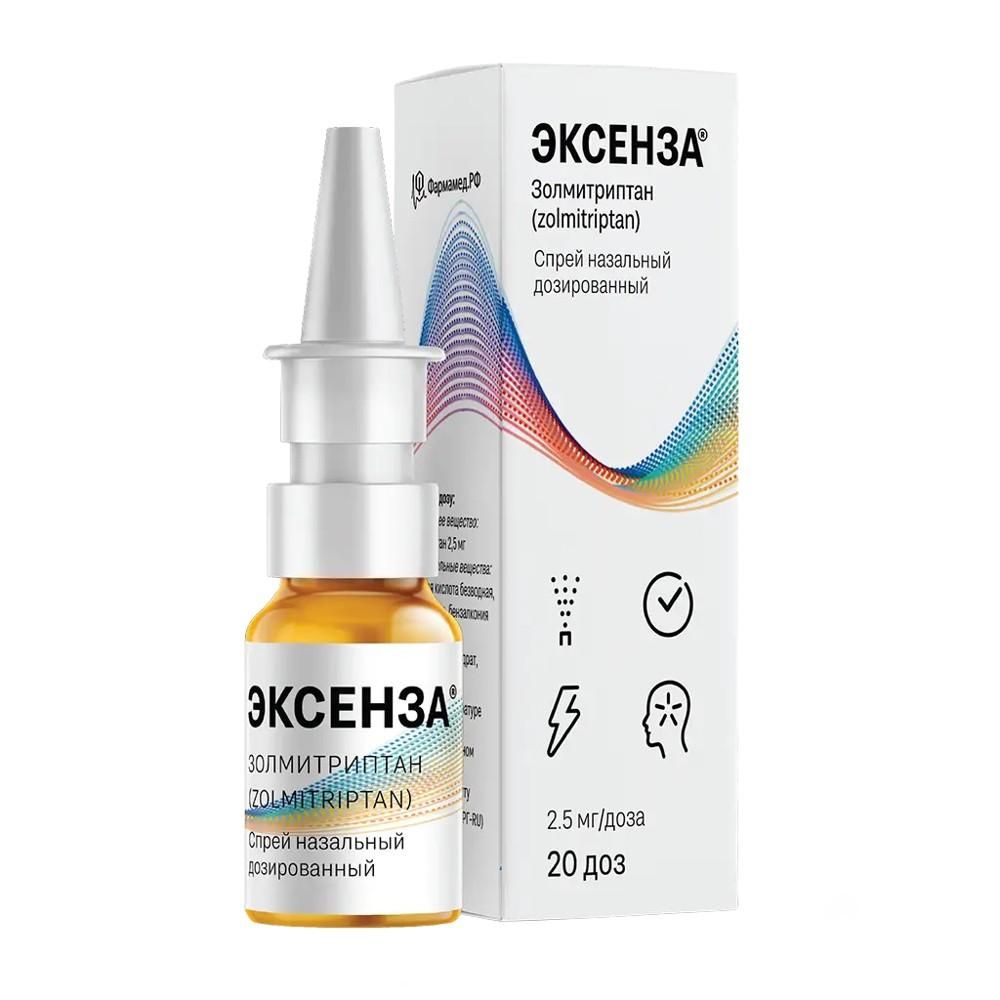 Всегда применяйте данный препарат в полном соответствии с рекомендациями лечащего врача или работника аптеки. При появлении сомнений посоветуйтесь с лечащим врачом или работником аптеки., Препарат Эксенза не показан для профилактики мигрени или кластерной головной боли., Рекомендуемая доза, Лечение мигрени, Рекомендуемая доза для лечения приступа мигрени составляет 2,5 мг или 5 мг. Для тех пациентов, у которых не достигается удовлетворительный эффект при приеме 2,5 мг, при последующих приступах может быть эффективной доза 5 мг., Желательно, чтобы препарат Эксенза принимался как можно раньше после начала мигренозной головной боли, но препарат также эффективен, если принимать его на более поздней стадии., Лечение кластерной головной боли, Рекомендуемая доза для лечения приступа кластерной головной боли составляет 5 мг или 10 мг. Для тех пациентов, у которых не достигается удовлетворительный эффект при приеме 5 мг, при последующих приступах может быть эффективной доза 10 мг., Общая суточная доза не должна превышать 10 мг, следовательно, не более 4 доз золмитриптана по 2,5 мг или 2 дозы золмитриптана по 5 мг следует принимать в любой 24-часовой период., Особые группы пациентов, Пациенты с нарушением функции печени, - Для пациентов со средней или тяжелой печеночной недостаточностью максимальная суточная доза не должна превышать 5 мг золмитриптана., - Для пациентов, принимающих ингибиторы МАО-А, максимальная суточная доза составляет 5 мг., - Пациентам, принимающим циметидин, максимальная суточная доза составляет 5 мг., - Пациентам, принимающим препараты ингибиторы СУР 1А2, такие как флувоксамин и хинолоны (например, ципрофлоксацин), максимальная суточная доза составляет 5 мг., Приступ кластерной головной боли, Пациенты с приступом кластерной головной боли могут ощущать заложенность носового хода на стороне локализации боли. В таких случаях впрыскивания препарата рекомендовано выполнять в ноздрю, расположенную на противоположной стороне., Если Вы применили препарат Эксенза больше, чем следовало , Если Вы применили препарат Эксенза больше, чем следовало, немедленно сообщите об этом лечащему врачу или обратитесь за медицинской помощью в ближайшее лечебно-профилактическое учреждение (возьмите препарат с собой)., Если Вы забыли применить препарат Эксенза , Не принимайте двойную дозу, чтобы компенсировать пропущенную дозу., При наличии вопросов по применению данного препарата, обратитесь к лечащему врачу или работнику аптеки.