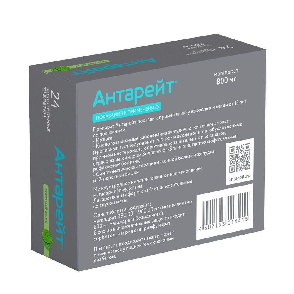 Антарейт 800мг таб.жев. №24 мятный вкус по цене от 564.22 руб в Екатеринбурге, купить Антарейт 800мг таб.жев. №24 мятный вкус (Валента фармацевтика ао) в аптеке Фармленд, инструкция по применению, отзывы