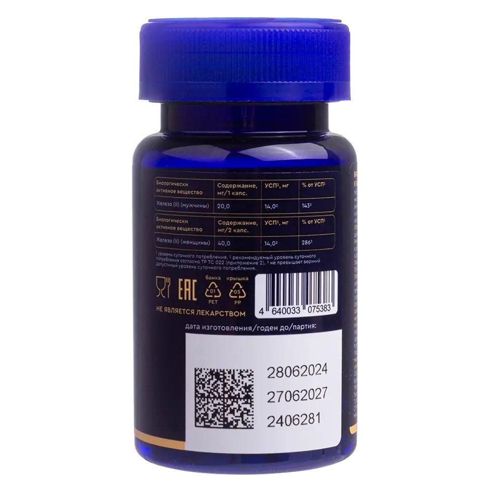 1 капсула (суточная доза для мужчин) содержит: Железо (из железа фумарата) - 20 мг; 2 капсулы (суточная доза для женщин) содержат:Железо (из железа фумарата) - 40 мг. Вспомогательные вещества: антислеживающий агент микрокристаллическая целлюлоза, антислеживающий агент кальциевая соль стеариновой кислоты, капсула (носитель гидроксипропилметилцеллюлоза).