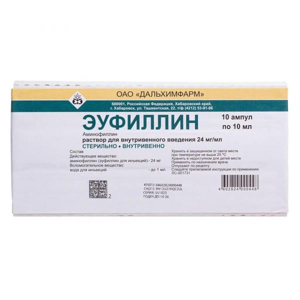 Эуфиллин 24мг/мл 10мл р-р д/ин.в/в. №10 амп. Дальхимфарм оао_1 в Екатеринбурге