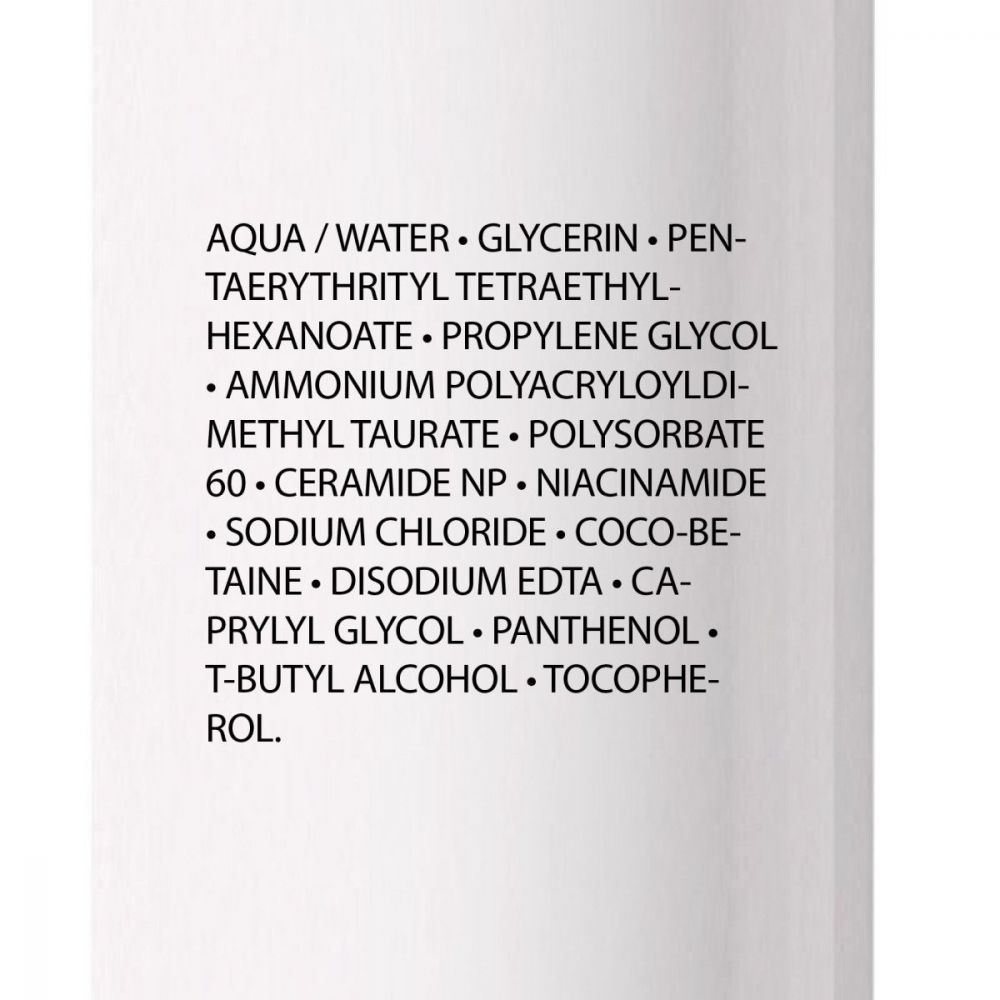 Aqua / Water, Glycerin, Pentaerythrityl Tetraethylhexanoate, Propylene Glycol, Ammonium Polyacryloyldimethyl Taurate, Polysorbate 60, Ceramide Np, Niacinamide, Sodium Chloride, Coco-Betaine, Disodium Edta, Caprylyl Glycol, Panthenol, T-Butyl Alcohol, Tocopherol.