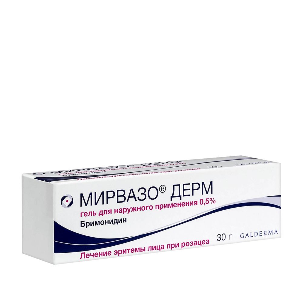 Препарат Мирвазо® Дерм не следует наносить на раздраженную кожу или открытые раны, на область вокруг глаз. В случае выраженного раздражения или аллергии необходимо прервать лечение препаратом., После применения препарата необходимо обязательно вымыть руки. Препарат Мирвазо® Дерм возможно использовать совместно с другими лекарственными препаратами, применяемыми для лечения воспалительных элементов розацеа. Они могут быть нанесены на кожу только после высыхания препарата Мирвазо® Дерм, а не одновременно с ним. После нанесения и высыхания препарата Мирвазо® Дерм возможно использование косметики. Эритема и гиперемия, Действие препарата Мирвазо® Дерм начинает ослабевать через несколько часов после нанесения. У некоторых пациентов было описано возобновление эритемы и транзиторной гиперемии в более тяжелой форме, чем наблюдалось до лечения. Большая часть случаев эритемы отмечалась в течение первых 2 недель после начала лечения., У некоторых пациентов наблюдалась транзиторная гиперемия. Время начала гиперемии после нанесения геля варьировало от 30 минут до нескольких часов., В большинстве случаев эритема и гиперемия проходили после отмены препарата., В случае усугубления эритемы применение препарата следует прекратить. Симптоматические меры, например, охлаждение, прием нестероидных противовоспалительных препаратов и антигистаминных препаратов, могут облегчить симптомы., После возобновления применения препарата Мирвазо® Дерм отмечались рецидивы обострений эритемы и гиперемии. Однако в случае необходимости лечение можно возобновить после восстановления функции кожного барьера, начиная с пробного нанесения препарата на небольшой участок лица не менее чем за 1 день до полного возобновления лечения всей кожи лица., Следует строго соблюдать рекомендованную дозу и частоту нанесения: один раз в день, очень тонким слоем., Необходимо избегать увеличения максимальной суточной дозы и/ или частоты применения, так как безопасность повышенных суточных доз или многократного ежедневного применения не установлена., Одновременное применение с системными агонистами альфа-адренергических рецепторов может усиливать побочные эффекты данного класса лекарственных препаратов у пациентов с:, - тяжелыми или неконтролируемыми, или нестабильными сердечно-сосудистыми заболеваниями;, - депрессией, недостаточностью мозгового или коронарного кровообращения, болезнью Рейно, ортостатической гипотензией, облитерирующими тромбоангиитами, склеродермией или синдромом Шегрена., В состав препарата Мирвазо® Дерм входит метилпарагидроксибензоат, который может вызвать аллергические реакции (возможно, замедленного типа), а также пропиленгликоль, который может привести к раздражению кожи., Влияние на способность управлять трансп. ср. и мех.:, Препарат не влияет или незначительно влияет на способность управлять транспортом или заниматься другими потенциально опасными видами деятельности, требующими повышенной концентрации внимания и быстроты психомоторных реакций.