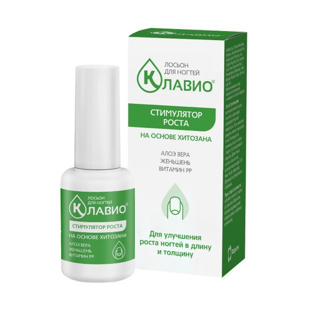 Основой лосьона КЛАВИО является водорастворимый хитозан – биологический полимер, способствующий выравниванию структуры ногтевой пластины и защищающий ее от проникновения внешних агрессивных веществ и потери влаги., Алоэ вера – биостимулятор ростковых зон ногтя, природный источник полезных веществ, необходимых для восстановления здоровых ногтей. , Женьшень обладает тонизирующим действием, стимулирует обменные процессы., Витамин РР стимулирует рост здоровых ногтей в длину и толщину. , Биотин (витамин Н, витамин В7) повышает эластичность и предотвращает расслоение ногтевых пластин.