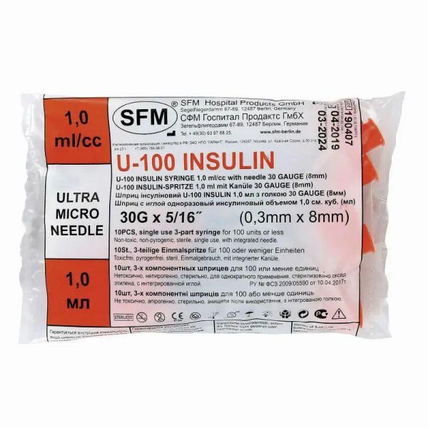 Шприц инсулиновый с интегрированной иглой состоит из трех компонентов: цилиндр, поршень и манжета. Имеет градуировку по шкале U-100, объем — 1 мл, размер иглы — 30G., Безболезненность инъекции обуславливается легким скольжением поршня, без трения. Удерживающее кольцо на поршне предотвращает потерю медикамента. Градуировка на шприце выполнена в единицах инсулина и позволяет легко считывать показания., Упакован по 10 штук в ПЭ пакете. Нетоксичен, апирогенен. Метод стерилизации – этиленоксид (EO).