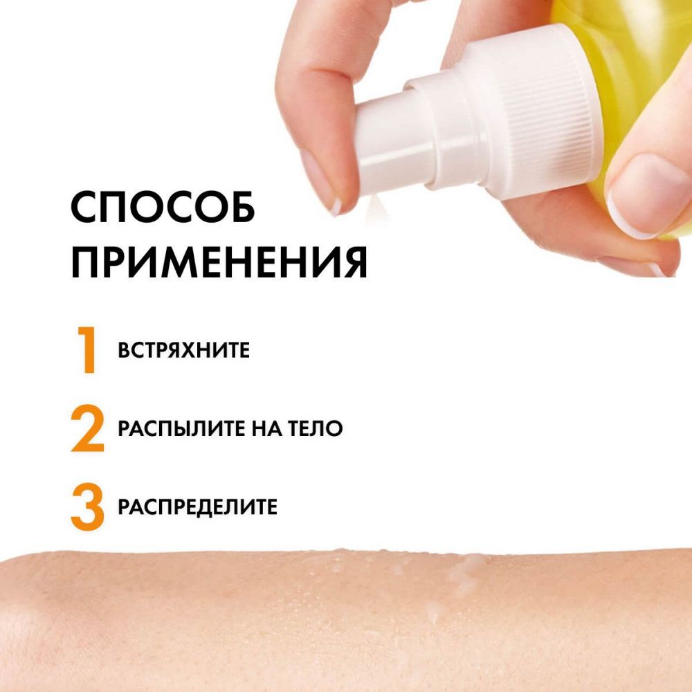 Хорошо встряхните перед применением. Распылите средство на тело и распределите руками. Используйте непосредственно перед выходом на солнце.