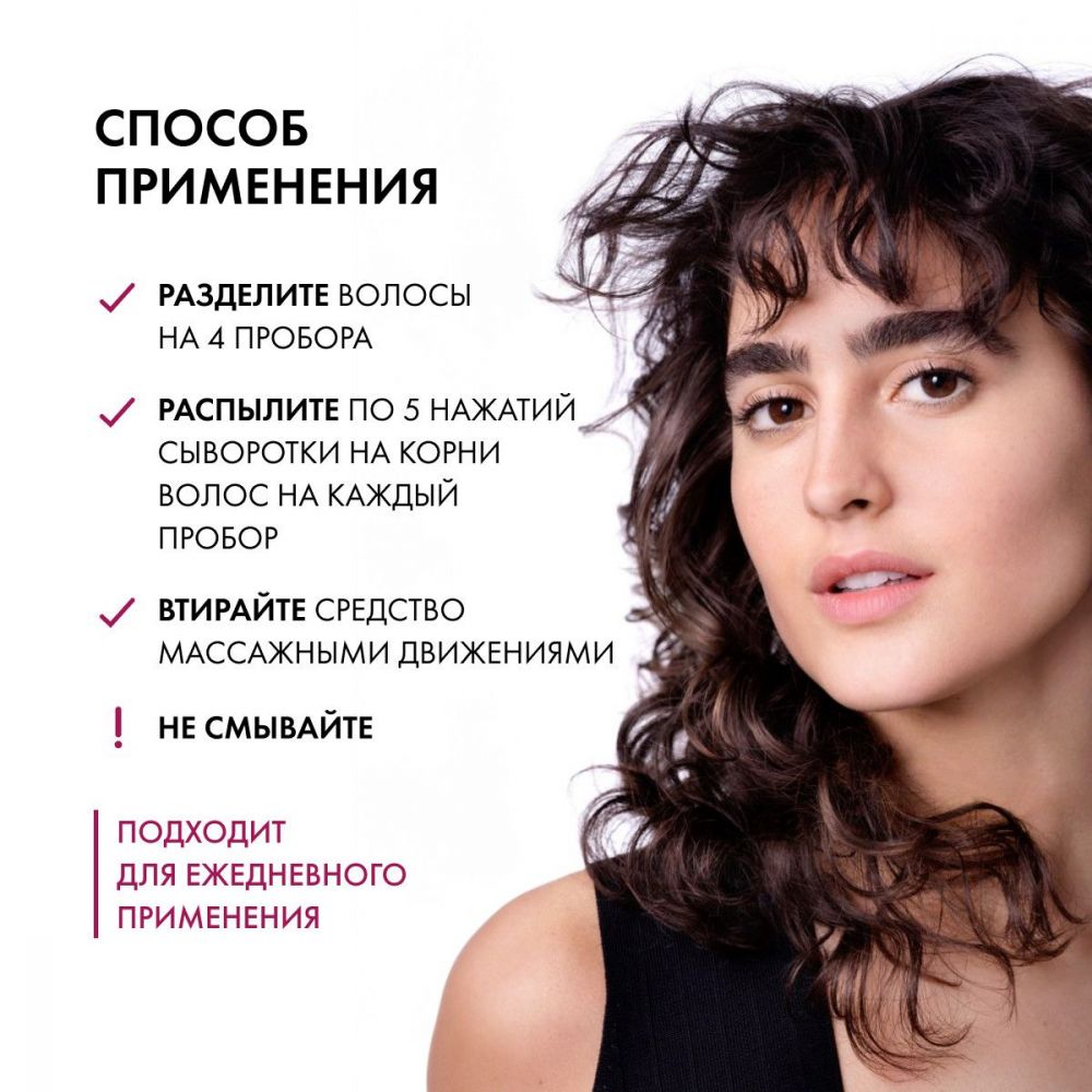 Эксперты Лабораторий VICHY разработали инновационную гамму средств по уходу за волосами, которая комплексно борется со всеми аспектами проблемы истончения волос. Сыворотка увеличивает количество волос, шампунь повышает их плотность, а бальзам восстанавливает структуру. Концентрированная сыворотка для кожи головы интенсивно воздействует на корни, пробуждая спящие фолликулы и стимулирует рост новых волос. С каждым применением волосы становятся заметно более сильными, густыми и крепкими. Легкий спрей-сыворотка для кожи головы имеет приятный аромат лемонграсса, мяты перечной и имбиря. Не утяжеляет волосы.