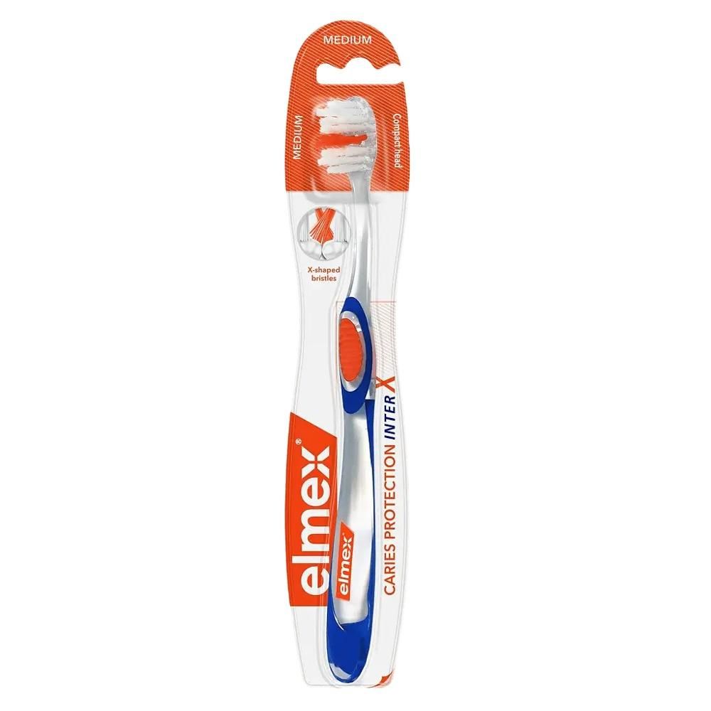 Зубная щетка Elmex защита от кариеса обеспечивает высокоэффективное удаление налета даже из труднодоступных межзубных промежутков. Запатентованная технология перекреста щетинок InterX характеризуется новым X-образным профилем щетинного поля: ряды длинных скрещенных пучков щетины, расположенных между параллельными рядами более коротких пучков.