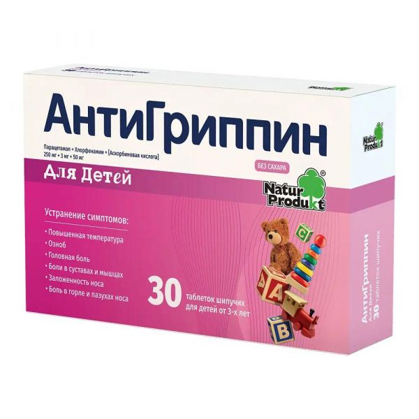 Антигриппин таб.шип. №30 д/детей по цене от 897.25 руб в Екатеринбурге, купить Антигриппин таб.шип. №30 д/детей (Natur produkt pharma sp.zo.o.) в аптеке Фармленд, инструкция по применению, отзывы