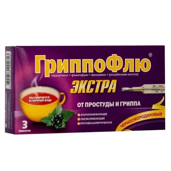 Купить Гриппофлю экстра от простуды и гриппа 13г пор.д/р-ра д/пр.внутр. №3 пак. черная смород. можно в аптеках Екатеринбурга, забронировать на сайте и в приложении