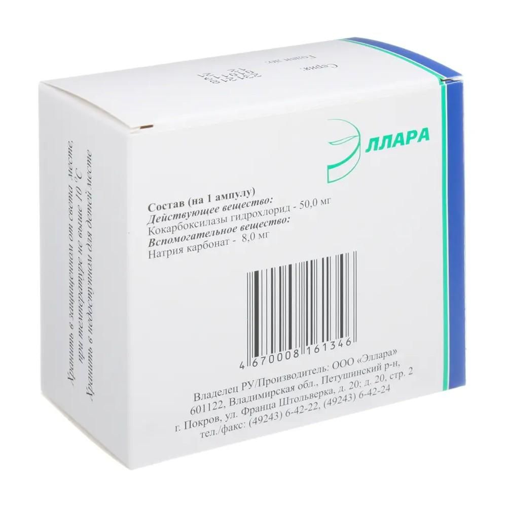 В одной ампуле содержится: , действующее веществ - кокарбоксилазы гидрохлорид 50 мг,, вспомогательное вещество - натрия карбонат 8 мг.