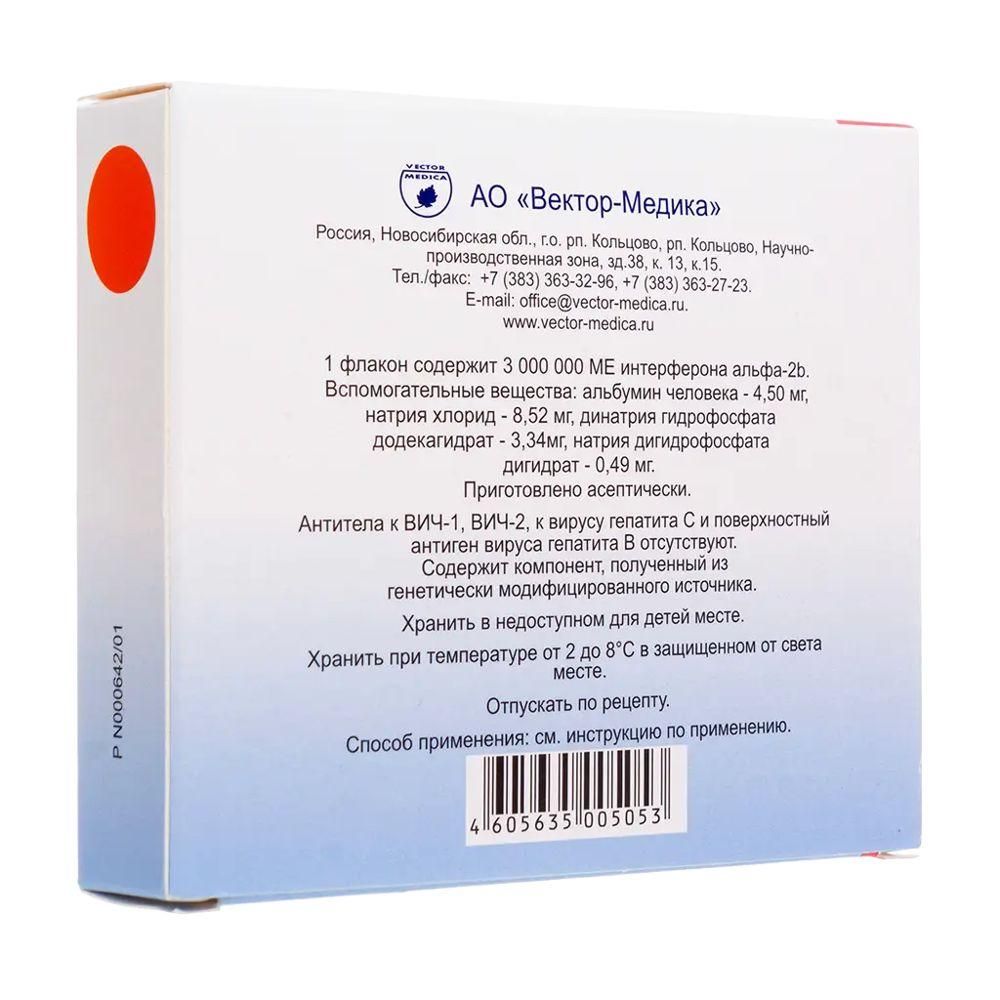 Состав: В одной ампуле или одном флаконе содержится:Активное вещество - интерферон альфа-2b человеческий рекомбинантный 0.5 млн ME:вспомогательные вещества: альбумин, раствор для инфузий 10% - 4,50 мг, натрияхлорид - 9,07 мг. натрия гидрофосфат додекагидрат - 2,74 мг, натрия дигидрофосфатдигидрат- 0,37 мг.Активное вещество - интерферон альфа-2b человеческий рекомбинантный 1 млн ME;вспомогательные вещества: альбумин, раствор для инфузий 10% - 4,50 мг, натрия хлорид- 8.96 мг, натрия гидрофосфат додекагидрат - 2,86 мг, натрия дигидрофосфат дигидрат -0.40 мг.Активное вещество - интерферон альфа-2b человеческий рекомбинантный 3 млн ME;вспомогательные вещества: альбумин, раствор для инфузий 10% - 4,50 мг, натрияхлорид - 8,52 мг. натрия гидрофосфат додекагидрат - 3,34 мг, натрия дигидрофосфатдигидрат - 0,49 мг.Активное вещество - интерферон альфа-2b человеческий рекомбинантный 5 млн ME;вспомогательные вещества: альбумин, раствор для инфузий 10% — 4,50 мг, натрия хлорид - 8,09 мг, натрия гидрофосфат додекагидрат - 3,82 мг, натрия дигидрофосфатдигидрат—0,58 мг.