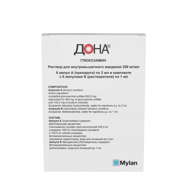 ДОНА – обладает противовоспалительным и обезболивающим действием, восполняет эндогенный дефицит глюкозамина, стимулирует синтез протеогликанов и гиалуроновой кислоты синовиальной жидкости; увеличивает проницаемость суставной капсулы, восстанавливает ферментативные процессы в клетках синовиальной мембраны и суставного хряща. Способствует фиксации серы в процессе синтеза хондроитинсерной кислоты, облегчает нормальное отложение кальция в костной ткани, тормозит развитие дегенеративных процессов в суставах, восстанавливает их функцию, уменьшая суставные боли.