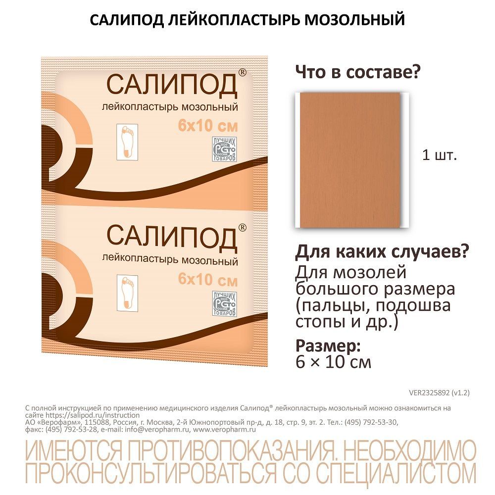 САЛИПОД лейкопластырь мозольный борется с сухими мозолями и натоптышами и помогает вернуть красоту Вашим ногам. Салициловая кислота помогает воздействовать на сухую мозоль, размягчая огрубевший верхний слой кожи, улучшая проникновение питательных веществ и облегчая естественное отшелушивание ороговевших клеток. Использование пластыря Салипод c cалициловой кислотой и серой помогает выравниванию рельефа кожи, уменьшению дискомфорта и неприятных ощущений. Использование Салипод позволяет не пачкать руки и одежду. Кератолитическое действие до 48 часов.