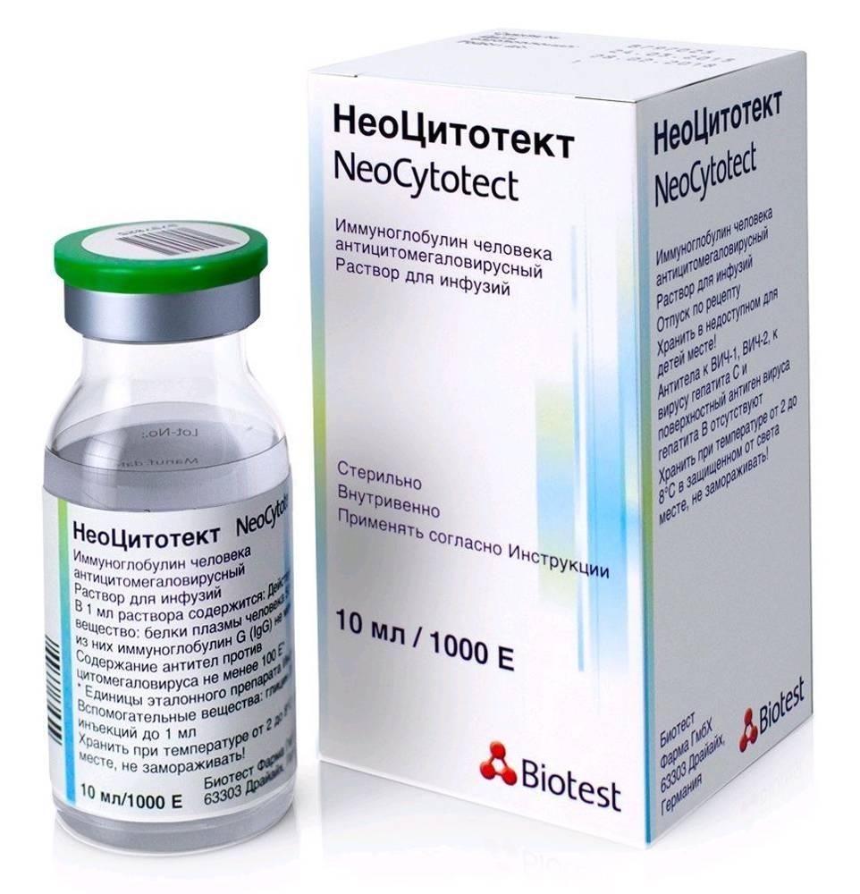 ри применении лекарственных препаратов из крови или плазмы человека вследствие передачи возбудителей инфекционных заболеваний заражение последними нельзя полностью исключить. Это касается также возбудителей до сих пор неизвестной природы. Чтобы снизить риск передачи возбудителей болезней, по строгим критериям проводится отбор доноров, тестируется и отбирается донорская плазма и контролируется пул плазмы. В производственный процесс включены стадии для удаления и/или инактивации возбудителей., Для изготовления НеоЦитотекта используется исключительно плазма здоровых доноров, в которой не были обнаружены антитела к ВИЧ тип 1 и 2, к вирусу гепатита С и поверхностный антиген вируса гепатита В, а также активность ферментов печени (трансаминазы) не превышает нормальное граничное значение. Дополнительно к тестированию плазмы отдельных доноров контролю подвергаются сначала минипулы (тестирование методом ПЦР на ВИЧ, вирусы гепатита А, В и С, парвовирус 19), а затем производственный пул плазмы, перерабатываемый на НеоЦитотект (повторное тестирование на антитела к ВИЧ -1,2, гепатиту В и С, а также методом ПЦР на ВИЧ, вирусы гепатита В и С). В производстве используется пул плазмы только при отрицательных результатах тестирования., НеоЦитотект изготавливают фракционированием этанолом на холоду. Для инактивации и удаления возможных вирусов проводят обработку три -н - бутилфосфатом/твином 80 и октановой кислотой., Меры предосторожности при применении, Определенные тяжелые побочные явления могут зависеть от скорости введения. Так как с ее увеличением связана тенденция к росту побочных явлений, следует строго соблюдать скорость введения, рекомендуемую в разделе "Способ применения и дозы"., Определенные побочные явления могут встречаться чаще всего :, при высокой скорости введениия, у пациентов с полным или частичным иммунодефицитом как при наличии так и при отсутствии IgA-дефицита;, у пациентов, получающих иммуноглобулин человека впервые или в редких случаях при переходе на другой препарат иммуноглобулина, или, если лечение иммуноглобулинами проводилось очень давно., Истинные реакции гиперчувствительности встречаются крайне редко, в случаях, при которых в крови отсутствует иммуноглобулин A (IgA) и образуются антитела к IgA., В редких случаях после введения иммуноглобулина возможно понижение кровяного давления и в единичных случаях - анафилактический шок, даже если пациент при предыдущем введении препарата не проявлял чрезмерной чувствительности., В большинстве случаев можно избежать возможных осложнений, если:, — удостовериться, что у пациента отсутствуют аллергические реакции на очень медленное введение иммуноглобулина (0,08 мл/кг/мин);, — внимательно наблюдать во время всего введения препарата за пациентом и следить за появлением признаков нежелательного действия. Особенно внимательно надо наблюдать в течение всей инфузии и по крайней мере в течение 1 часа после ее окончания, за пациентами никогда ранее не получавшими иммуноглобулины человека, или получавшими другие иммуноглобулины, или которым иммуноглобулины вводились очень давно., Все остальные пациенты должны находиться под наблюдением, по крайней мере, в течение 20 мин после окончания введения., Существуют подозрения о взаимосвязи между введением внутривенных иммуногл