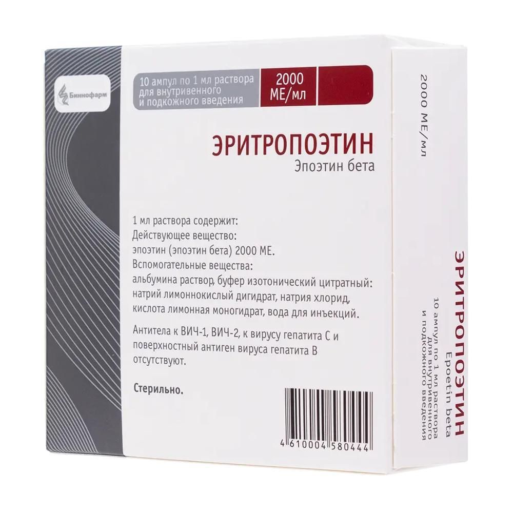 Эритропоэтин 2000ме/мл 1мл р-р д/ин.в/в.,п/к. №10 амп. по цене от 8110.70 руб в Екатеринбурге, купить Эритропоэтин 2000ме/мл 1мл р-р д/ин.в/в.,п/к. №10 амп. (Биннофарм зао) в аптеке Фармленд, инструкция по применению, отзывы
