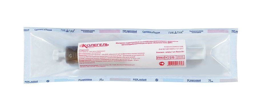 Материал гидрогелевый на основе альгината натрия с деринатом (дезоксирибонуклеатом натрия) и лидокаином «Колетекс-гель-ДНК-Л» 20 г, шприц. Гель для внутриполостного введения, стерильный, в шприцах по 20г. Каждый шприц в индивидуальной стерильной упаковке вместе с инструкцией по применению, помещенный в картонную коробку.
