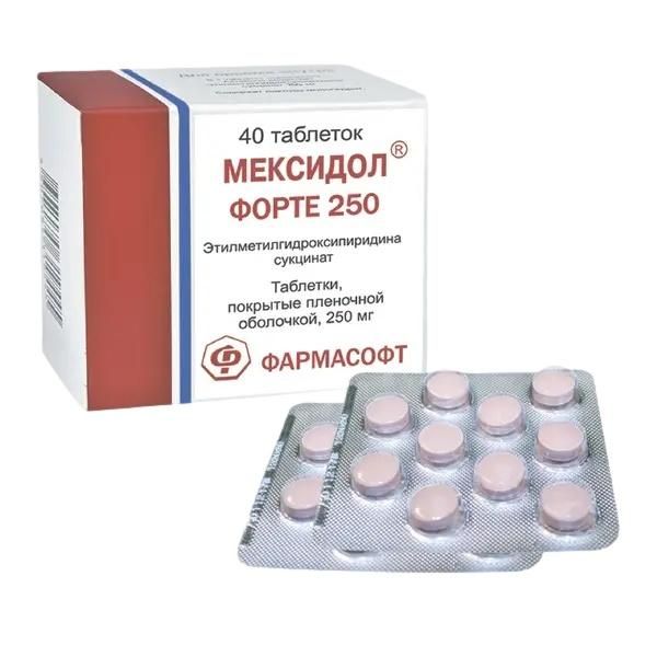 Механизм действияОтносится к классу 3-оксипиридинов. Механизм действия препарата Мексидол ФОРТЕ 250 обусловлен антиоксидантным, антигипоксантным и мембранопротекторным действием. Препарат ингибирует перекисное окисление липидов, повышает активность супероксиддисмутазы, повышает соотношение липид-белок, улучшает структуру и функцию мембраны клеток. Вызывает усиление компенсаторной активации аэробного гликолиза и снижение степени угнетения окислительных процессов в цикле Кребса в условиях гипоксии с увеличением содержания АТФ и креатинфосфата, активацию энергосинтезирующих функций митохондрий. Поддерживает развивающуюся при острой ишемии активацию аэробного гликолиза и способствует в условиях гипоксии восстановлению митохондриальных окислительно-восстановительных процессов, увеличивает синтез АТФ и креатинфосфата. Препарат модулирует активность мембраносвязанных ферментов (кальций-независимой фосфодиэстеразы, аденилатциклазы, ацетилхолинэстеразы), рецепторных комплексов (бензодиазепинового, ГАМК, ацетилхолинового), что усиливает их способность связывания с лигандами, способствует сохранению структурно-функциональной организации биомембран, транспорта нейромедиаторов и улучшению синаптической передачи. В условиях критического снижения коронарного кровотока способствует сохранению структурно-функциональной организации мембран кардиомиоцитов, стимулирует активность мембранных ферментов - фосфодиэстеразы, аденилатциклазы, ацетилхолинэстеразы.Мексидол ФОРТЕ 250 повышает содержание в головном мозге допамина.Фармакодинамические эффектыМексидол ФОРТЕ 250 является ингибитором свободнорадикальных процессов, мембранопротектором, обладающим антигипоксическим действием, стресс-протекторным, ноотропным, противоэпилептическим и анксиолитическим действием. Препарат повышает резистентность организма к воздействию различных повреждающих факторов при патологических состояниях (гипоксии и ишемии, нарушении мозгового кровообращения, интоксикации этанолом и антипсихотическими средствами). Антистрессорное действие проявляется в нормализации постстрессового поведения, соматовегетативных нарушений, восстановлении циклов "сон-бодрствование", нарушенных процессов обучения и памяти, снижении дистрофических и морфологических изменений в различных структурах головного мозга. Обладает гиполипидемическим действием, уменьшает содержание общего холестерина и ЛПНП. Мексидол ФОРТЕ 250 улучшает функциональное состояние ишемизированного миокарда. Обеспечивает целостность морфологических структур и физиологических функций ишемизированного миокарда. В условиях коронарной недостаточности увеличивает коллатеральное кровоснабжение ишемизированного миокарда, способствует сохранению целостности кардиомиоцитов и поддержанию их функциональной активности. Эффективно восстанавливает сократимость миокарда при обратимой сердечной дисфункции. Стабилизирует мембранные структуры клеток крови (эритроцитов и тромбоцитов), снижая вероятность развития гемолиза.Клиническая эффективность и безопасностьУлучшает метаболизм и кровоснабжение головного мозга, улучшает микроциркуляцию и реологические свойства крови, уменьшает агрегацию тромбоцитов.Улучшает клиническое течение инфаркта миокарда, повы