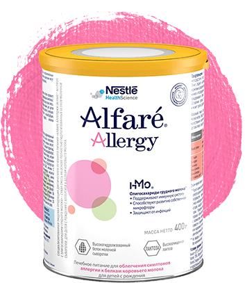Alfaré® Allergy HMO® (Алфаре Аллерджи с олигосахаридами грудного молока), лечебная смесь на основе полностью гидролизованных белков молочной сыворотки для диетотерапии слабых и умеренных симптомов аллергии на белок коровьего молока у детей с рождения (кожные проявления, атопия, респираторные симптомы). максимально приближена по составу к грудному молоку., Первая в России высокогидролизованная смесь с лактозой и комплексом олигосахаридов 2’-фукозилактоза (2’FL) и лакто-N-неотетраоза (LNnT), структурно идентичных олигосахаридам грудного молока, доказанно нормализует состав кишечной микрофлоры, которая нарушена у детей с АБКМ, укрепляет барьерные функции слизистой кишечника, доказанно снижает риск и количество инфекций верхних и нижних дыхательных путей, выводит патогены из организма. , Может использоваться в качестве единственного источника питания.