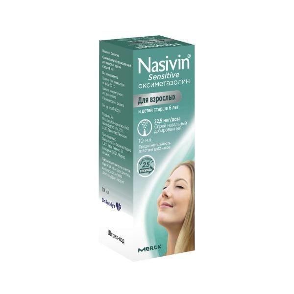 Називин® Сенситив спрей назальный дозированный 22,5 мкг/дозу предназначен для инраназального введения., Взрослым и детям старше 6 лет: по 1 впрыскиванию Називин® Сенситив спрея назального дозированного 22,5 мкг/дозу в каждую ноздрю 2-3 раза в сутки. Если симптомы усиливаются или улучшение не наступает в течение 3-х дней, необходимо проконсультироваться с врачом. В рекомендованной дозе без консультации с врачом применять не более 7 дней., Дозы выше рекомендованных можно применять только под наблюдением врача. Одно впрыскивание объемом 45 мкл содержит 22,5 мкг оксиметазолина гидрохлорида - для Називин® Сенситив спрея назального дозированного 22,5 мкг/дозу.