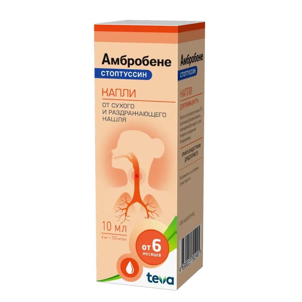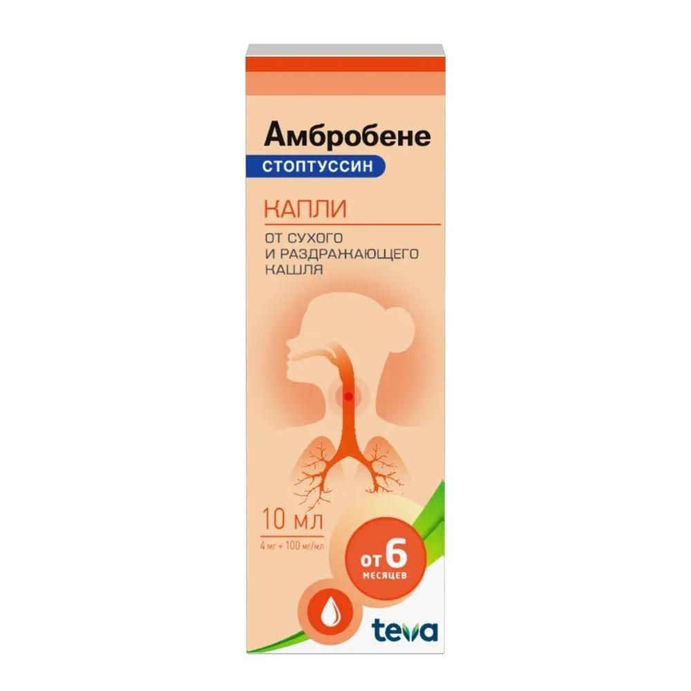 Амбробене стоптуссин 100мг+4мг/мл 10мл капли д/пр.внутр. №1 фл.-кап. по цене от 197.80 руб в Екатеринбурге, купить Амбробене стоптуссин 100мг+4мг/мл 10мл капли д/пр.внутр. №1 фл.-кап. (Teva czech industries s.r.o._2) в аптеке Фармленд, инструкция по применению, отзывы