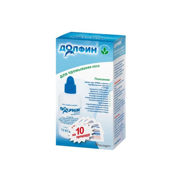 В комплекс "Долфин" входит устройство объёмом 240 мл и средство для приготовления раствора - 10 пакетов по 2 гр.