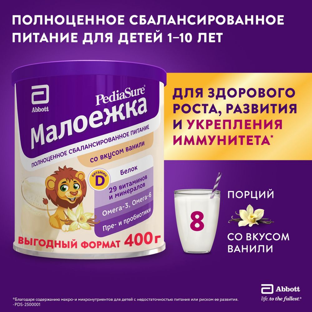 В отличие от популярных перекусов (таких как молоко детское, йогурт питьевой, молочный коктейль, пюре в паучах или печенье), Малоежка от ПедиаШур — это сбалансированное сочетание полноценного белка, жиров, углеводов, а также всех необходимых витаминов и минералов, которое поможет обеспечить ребенка хорошим уровнем энергии.