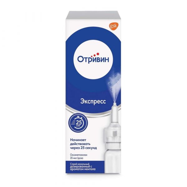 Спрей от насморка Отривин Экспресс начинает действовать уже через 25 секунд после использования, действует до 12 часов. (1), В составе спрея — действующее вещество оксиметазолин, которое оказывает сосудосуживающее действие, уменьшая заложенность носа и отек слизистой оболочки. А дополнительные компоненты ментол и эвкалиптол дарят приятное ощущение свежести дыхания, мягко охлаждая слизистую носа., Отривин Экспресс помогает восстановлению носового дыхания. Применение оксиметазолина в составе препарата Отривин Экспресс способствует сокращению продолжительности насморка c 6 до 4 дней при остром вирусном рините. (1), Активные вещества спрея помогают бороться с симптомами*:, • простудного насморка,, • острого аллергического ринита,, • синусита. (2), Выберите Отривин, который может подойти именно вам: Отривин Ментол (3) освежающим ароматом ментола и эвкалипта; Отривин Увлажняющая формула (4); который защищает от сухости и раздражения слизистой, Отривин Комплекс (5) с двумя активными компонентами, способствующими устранению заложенности и течения из носа; Отривин Для детей (6) с 2 лет., *С полным перечнем показаний можно ознакомиться в инструкции по применению препарата Отривин Экспресс РУ П №004409 от 16.05.2022., 1. Инструкция по медицинскому применению препарата Отривин Экспресс РУ П №004409 от 16.05.2022., 2. Действующее вещество: оксиметазолина гидрохлорид., 3. Листок-вкладыш Отривин Ментол ЛП-№(002231)-(РГ-RU) от 25.04.2023., 4. Листок-вкладыш Отривин Увлажняющая формула 6+ ЛП-№(001789)-(РГ-RU) от 08.02.2023., 5. Инструкция по медицинскому применению препарата Отривин Комплекс РУ П №002976 от 20.05.2022., 6. Инструкция по медицинскому применению Отривин Для детей Увлажняющая формула 2+ ЛП-№(002198)-(РГ-RU) от 18.04.2023.