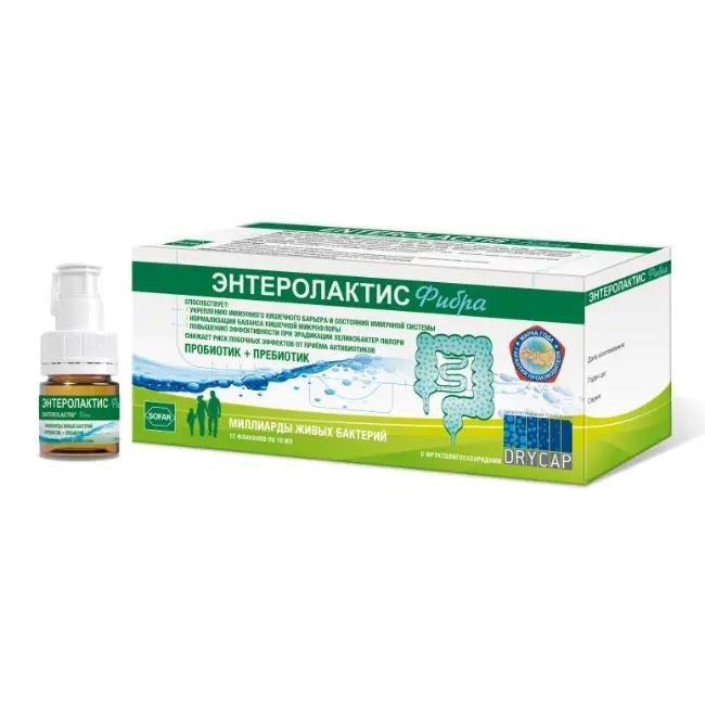 ЭНТЕРОЛАКТИС Фибра – это комбинация пробиотика (Lactobacillus paracasei, штамм CNCM I-1572 (L. casei DG)) и пребиотика (фруктоолигосахариды), которая способствует восстановлению нормальной микрофлоры кишечника и препятствует росту потенциально вредоносных бактерий., В составе ЭНТЕРОЛАКТИС Фибра – живые пробиотические молочнокислые бактерии человеческого происхождения (Lactobacillus paracasei), тщательно отобранные, отличающиеся большой жизненной силой и адгезионной способностью, способствующие восстановлению сбалансированного состава нормальной кишечной флоры, а так же растворимая клетчатка фруктоолигосахаридов, выполняющая роль пребиотика и являющаяся основной пищей для нормальной кишечной микрофлоры человека., ЭНТЕРОЛАКТИС Фибра содержит Lactobacillus paracasei, штамм CNCM I-1572 (L. casei DG) депонированные в Национальной коллекции культур микроорганизмов (CNCM, Институт Пастера, Франция) под номером I-1572 и являющиеся результатом исследований компании «СОФАР»., Основные характеристики данного штамма Lactobacillus: присутствует в кишечном тракте здорового человека (видоспецифичен); устойчив в кислой среде желудка, к желчным кислотам и пищеварительным ферментам: это важное условие для попадания в кишечник в живом виде после приёма внутрь; легко адгезируется (прилипает) к клеткам слизистой кишечника, что является непременным условием для нормальной колонизации; обладает высокой способностью к росту; устойчив к лиофилизации, гарантируя получение конечного продукта с высокой концентрацией живых микроорганизмов; стабилен при длительном хранении, поэтому не требует особых условий консервации., Lactobacillus paracasei, содержащиеся в ЭНТЕРОЛАКТИС Фибра, способны эффективно помогать восстановлению бактериального равновесия и формированию защитного барьера против патогенных агентов в кишечнике, препятствуя адгезии и росту вредоносных бактерий., Фруктоолигосахариды (ФОС) в составе ЭНТЕРОЛАКТИС Фибра – это растворимая клетчатка, присутствующая во многих обычных фруктах, овощах и растениях, в неизменном состоянии проходящая через желудок и тонкий кишечник к толстому кишечнику. В толстом кишечнике ФОС выполняют роль пребиотика, поскольку являются основной пищей для бактерий, составляющих нормальную кишечную флору человека., Фруктоолигосахариды, стимулируя рост и пролиферацию бактерий, вносят дополнительный вклад в быстрое восстановление нарушенной флоры кишечника. Добавление растворимой клетчатки ФОС необходимо кроме того при недостаточном её содержании в диете. Один флакон ЭНТЕРОЛАКТИС Фибра содержит более 5 г фруктоолигосахаридов., ЭНТЕРОЛАКТИС Фибра – это комбинация пробиотика и пребиотика, прекрасно подходящая, для правильной колонизации кишечного тракта человека. ЭНТЕРОЛАКТИС Фибра способствует: нормализации баланса кишечной микрофлоры; укреплению иммунного кишечного барьера и улучшению функционального состояния иммунной системы организма; повышению эффективности при эрадикации Хеликобактер пилори (Helicobacter pylori); устранению нарушений поведения и эмоциональных расстройств, улучшает настроение. Снижает риск побочных эффектов от приёма антибиотиков.