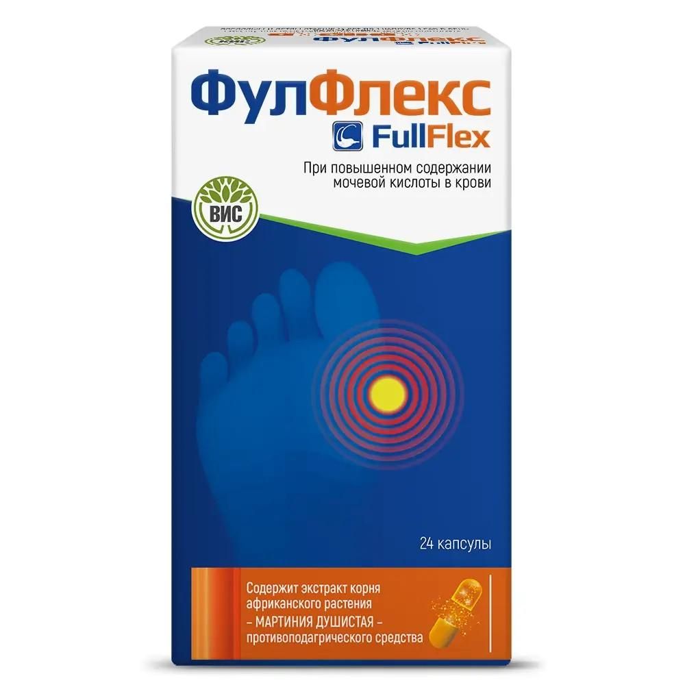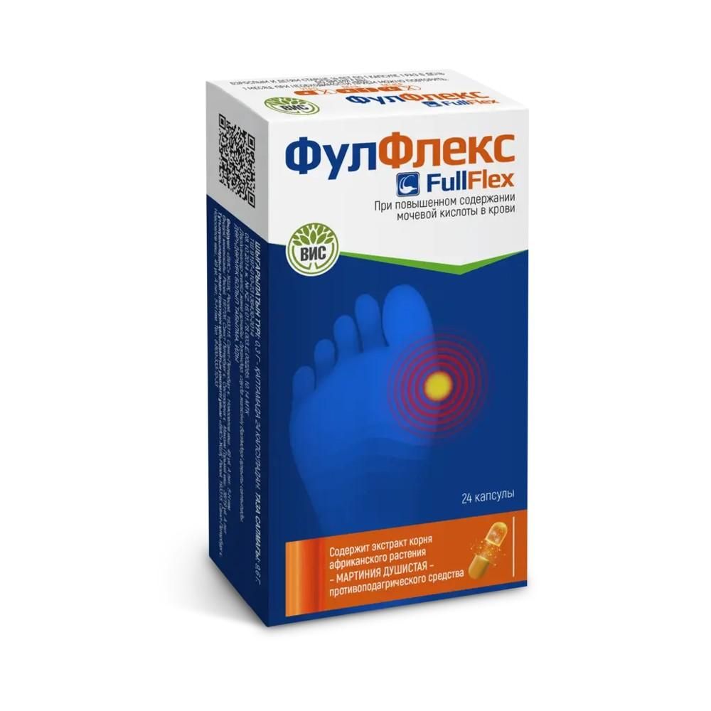 Капсулы «Фулфлекс» рекомендуются в качестве биологически активной добавки к пище – источника рутина, харпагозидов для лиц с повышенным содержанием мочевой кислоты в крови., Нарушение пуринового обмена приводит к повышению концентрации мочевой кислоты в крови и моче, образованию уратных кристаллов и их отложению в мягких тканях, в том числе в области суставов верхних и нижних конечностей. Отложения кристаллов мочевой кислоты (ураты) формируют узелковые подкожные образования – тофусы. Тофусы могут инфицироваться, вызывать боль и приводить к снижению функции сустава., Экстракт мартинии душистой содержит много биологически активных соединений. Мартиния имеет долгую историю традиционного использования и чаще всего используется при болях в спине, мышечных болях , а также болях в суставах.(1), Гарпагозид мартинии подавляет образование и высвобождение из макрофагов провоспалительных цитокинов, ингибирует экспрессию циклооксигеназы 2-го типа и NO - синтазы в фибробластах и тормозит развитие перекисного окисления липидов, что приводит к подавлению воспалительной реакции и развитию обезболивающего эффекта. (2), В составе капсул "Фулфлекс" 260 мг стандартизированного экстракта Мартинии душистой (Harpagophytum procumbens, кошачий коготь, тигровый коготь , ледяное растение, коготь дьявола), экстракт коры белой ивы и рутин., Активные компоненты капсул "Фулфлекс" способствуют уменьшению воспаления в суставах, снятию отечности в суставах и уменьшению неприятных и болезненных ощущений в суставах., 1. Гксаба, Номагугу и Мадира Коутлин Манганьи. 2022. «Борьба с инфекцией и болью: коготь дьявола (Harpagophytum procumbens ) - богатый источник противовоспалительной активности: 2011–2022» Molecules 27, no. 11: 3637., 2. Обзор исследований эффективности экстракта мартинии душистой / Савустьяненко А.В / Боль. Суставы. Позвоночник. 2014. № 3 (15). С. 45–53.