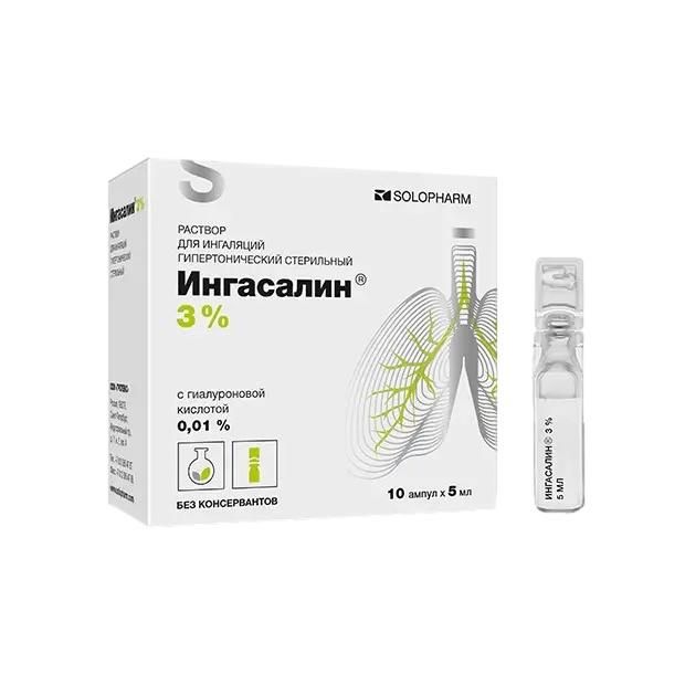 Рекомендуется использовать любой струйный или мембранный небулайзер. Для раствора Ингасалин® можно применять ультразвуковой ингалятор (например, Ингалятор ультразвуковой SOLOPHARM NM211E)., Дыхание должно быть в нормальном темпе на протяжении ингаляционной терапии, которая длится около 10 мин., Для ингаляции следует использовать раствор комнатной температуры., Применяют по 1 ампуле (4 или 5 мл) раствора 2 раза/сут или соответственно предписанию врача. Лечение можно начать с меньшего количества раствора и увеличивать дозу постепенно., Порядок работы с раствором, 1. Перед использованием раствора необходимо прочитать инструкцию производителя небулайзера., 2. Подготовить небулайзер согласно инструкции производителя., 3. Взять ампулу и встряхнуть ее, удерживая за горлышко, 4. Сдавить ампулу рукой, при этом не должно происходить выделение раствора, и вращающими движениями повернуть и отделить клапан, 5. Выдавить раствор в резервуар небулайзера, 6. Использовать небулайзер согласно инструкции его производителя., 7. Раствор, оставшийся неиспользованным в камере небулайзера, следует выливать сразу же после каждого использования., 8. Тщательно вымыть небулайзер., Необходимо следовать инструкции по применению, обслуживанию и чистке небулайзера.